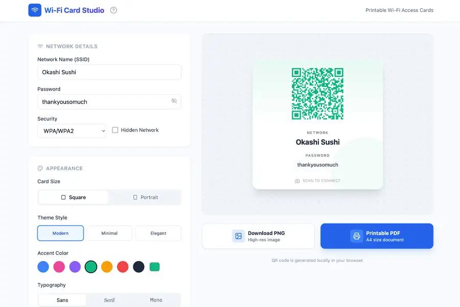 Generate stylish Wi-Fi cards with QR codes that customers can scan instantly. Ideal for cafes, restaurants, offices, and retail stores.